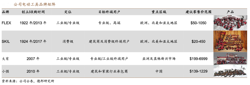 經典案例:根據公司公告、德邦研究所等綜合資訊表明,泉峰公司目前擁有 FLEX、SKIL、大有、小強四個電動工具品牌,其中 FLEX、大有、 小強專注于專業級/工業級產品,SKIL 專注于消費級電動工具。公司 2007 年、2010 年推出大有、小強電動工具自有品牌,分別針對高端專業以及建材家居裝修市場; 2013 年收購 FLEX、2017 年收購 SKIL,重點突破北美歐洲等海外市場。