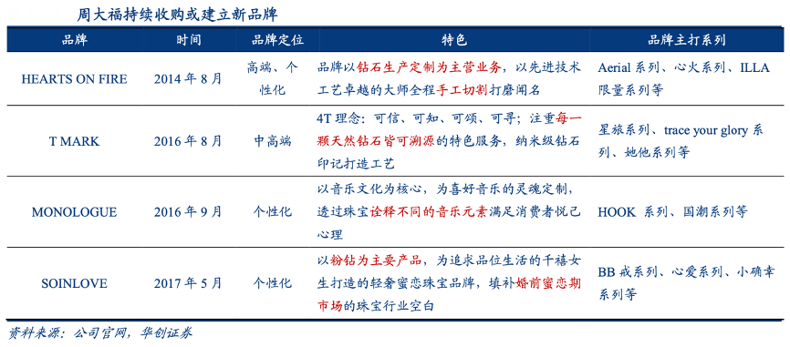 經典案例:根據公司官網、華創證券等綜合資訊表明,自 2014 年開始,周大福逐步創立新品牌,構建品牌矩陣。隨著顧客需求漸趨于個性化及多元化,公司緊接推出以音樂為創作靈感的 MONOLOGUE、為千禧女生設計的輕奢蜜戀珠寶 SOINLOVE、和主打彩色珠寶的 ENZO。目前品牌矩陣已經成型,可進一步吸引各類消費者,打開千禧代市場。