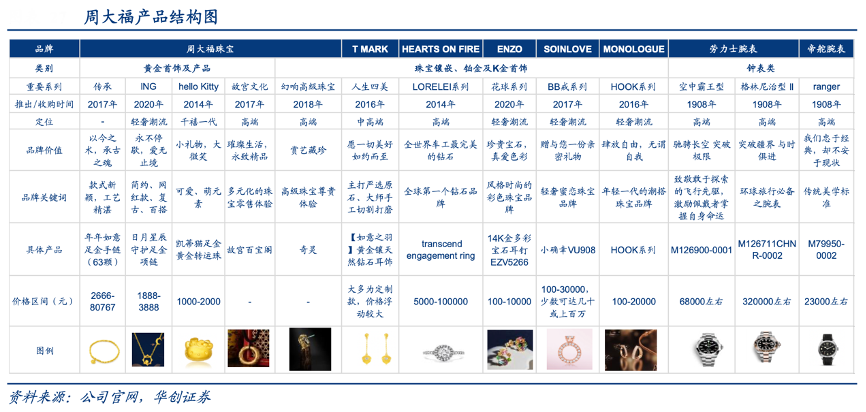 經(jīng)典案例:根據(jù)公司官網(wǎng)、華創(chuàng)證券等綜合資訊表明,周大福在黃金首飾及產(chǎn)品FY2018-2022年復(fù)合增長(zhǎng)率6.6%,珠寶鑲嵌類(lèi)則因黃金首飾產(chǎn)品與鐘表類(lèi)占比上升,占比有所下降,占比約21.7%,其中 T MARK 因獨(dú)特定制模式收入持續(xù)提升。