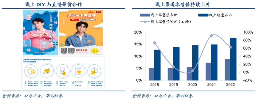 2020 年初,公司推出“云商 365”微信小程序, 將客戶(hù)引流到公司網(wǎng)絡(luò)旗艦店,通過(guò)小程序連接顧客與員工,顧客透過(guò)手機(jī)享受一站式服務(wù)。隨著 2020 年“云商 365”與“云柜臺(tái)”的推出,F(xiàn)Y2021/FY2022 線(xiàn)上零售值占比相對(duì)大幅增大,分別為 7.1%/8.6%,同 增 2.1%/1.5%。