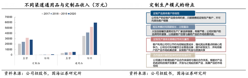 經典創新案例:根據公司招股書、國海證券研究所等綜合資訊表明,千味央廚公司在定制品合作保密期過后,會根據市場需求將部分產品進行改良后批量生產,銷售到更多的中小餐飲門店,其對通用品品相的穩定性要求更高,適合后廚設備更簡單的中小客戶使用,對后廚人員專業性要求低,規模化生產后產品也更具性價比。2020 年公司通用品銷售占比為 69.0%, 2017-2020 年收入 CAGR 為 19.2%。