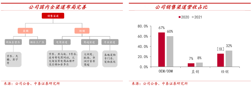 經(jīng)典案例:根據(jù)公司公告、中泰證券研究所等綜合資訊表明,中寵股份公司目前在國內(nèi)銷售渠道布局完善,占比均衡。線上渠道包括京東、天貓、抖音、拼多多等電商渠道。 線下渠道包括專業(yè)渠道(寵物醫(yī)院、寵物專門店等)和商超渠道等。2021年公司直營(直接面向消費者)收入占比為8.2%,經(jīng)銷(電商、 商超、專業(yè)渠道)收入占比為31.7%。