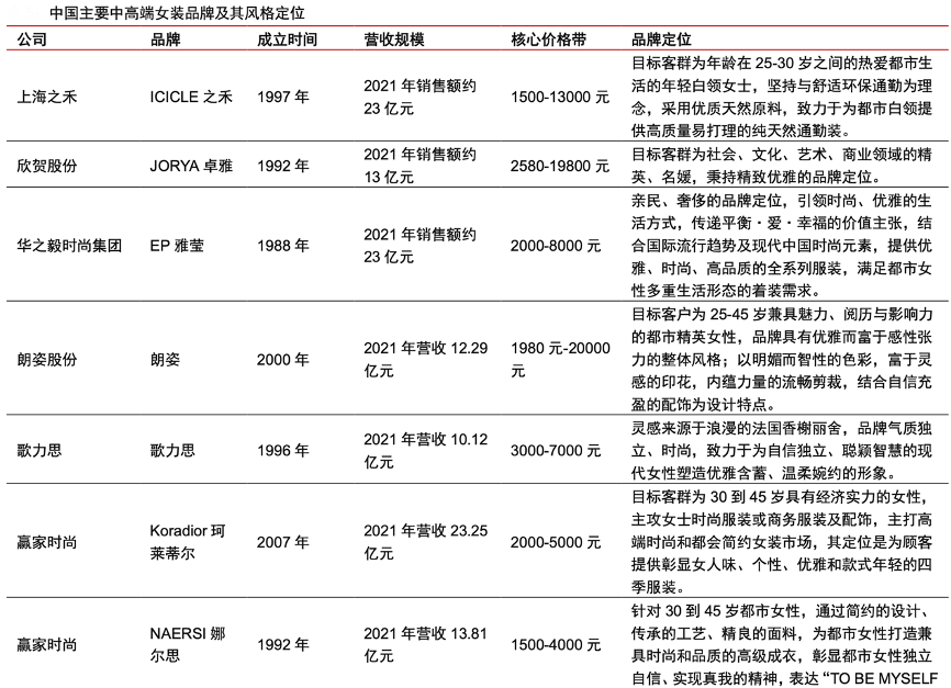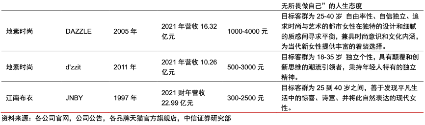 經(jīng)典案例:根據(jù)各公司官網(wǎng)、公司公告、各品牌天貓官方旗艦店、中信證券研究部等綜合資訊表明,國內(nèi)中高端女裝品牌大多目標客群為 25 到 40 歲都市女性,大致可以分為商務、時尚、潮流三類 品牌定位,核心價格帶集中于 2000 到 5000 元之間。其中規(guī)模超過 10 億元的中高端女裝 品牌數(shù)量較少,贏家時尚(珂萊蒂爾、娜爾思)、地素時尚(DAZZLE、d'zzit)旗下分別擁有 2 個超 10 億女裝品牌。