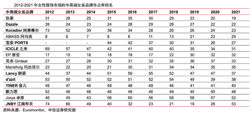 經(jīng)典案例:根據(jù)Euromonitor、中信證券研究部等綜合資訊表明,結合Euromonitor 數(shù)據(jù),過去 10 年我國女性服飾品牌中,多數(shù)中高端女裝品牌市占率呈現(xiàn)提升趨勢,其中玖姿、珂萊蒂爾、 之禾等國產(chǎn)品牌表現(xiàn)突出,2021 年市占率分別居 19、23、31 位,相比 2012 年分別提升 12、50、38 位。