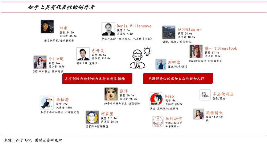 經(jīng)典案例:根據(jù)知乎APP、國(guó)聯(lián)證券研究所等綜合資訊表明,截至 2022 年 6 月,知乎平臺(tái)內(nèi)容創(chuàng)作者累計(jì)達(dá)5910 萬人,貢獻(xiàn) 4.62 億條問答內(nèi)容,覆蓋超過 1000 個(gè)垂直領(lǐng)域。其中,領(lǐng)域深耕者是優(yōu)質(zhì)內(nèi)容創(chuàng)作主力,“領(lǐng)域深耕”指專注于垂直領(lǐng)域內(nèi)容創(chuàng)作的用戶。