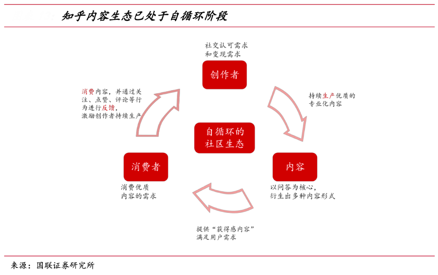經(jīng)典案例:根據(jù)國聯(lián)證券研究所等綜合資訊表明,知乎內(nèi)容生態(tài)主要由創(chuàng)作者、內(nèi)容、消費(fèi)者三部分構(gòu)成。創(chuàng)作者在平臺(tái)上選擇問題,進(jìn)行回答并上傳答案,或者創(chuàng)作并上傳視頻、直播等其他內(nèi)容。消費(fèi)者則選擇自己感興趣的內(nèi)容進(jìn)行瀏覽,并進(jìn)行點(diǎn)贊、評(píng)論、關(guān)注。當(dāng)前三方已處于自循環(huán)階段,即創(chuàng)作者 持續(xù)生產(chǎn)內(nèi)容,消費(fèi)者進(jìn)行消費(fèi)及反饋。