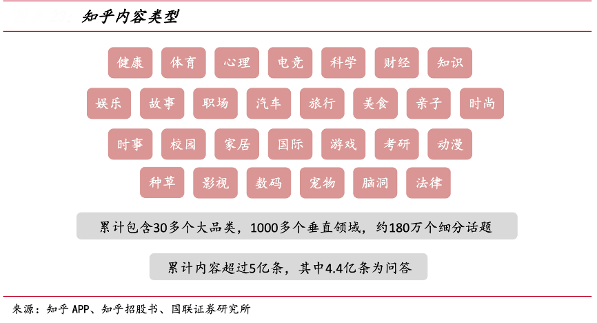 經(jīng)典案例:根據(jù)知乎APP、知乎招股書、國聯(lián)證券研究所等綜合資訊表明,隨著 用戶不斷增長,知乎為了滿足用戶多樣化、碎片化獲取內(nèi)容的需求,不斷拓寬內(nèi)容廣度。比如拓展小說、生活方式相關(guān)內(nèi)容,滿足女性用戶需求,拓展軍事、科技類內(nèi)容,滿足男性用戶需求。截至目前,內(nèi)容社區(qū)累計(jì)包含 30 多個(gè)大品類,1000 多個(gè)垂直領(lǐng) 域,涵蓋約 180 萬個(gè)細(xì)分話題。