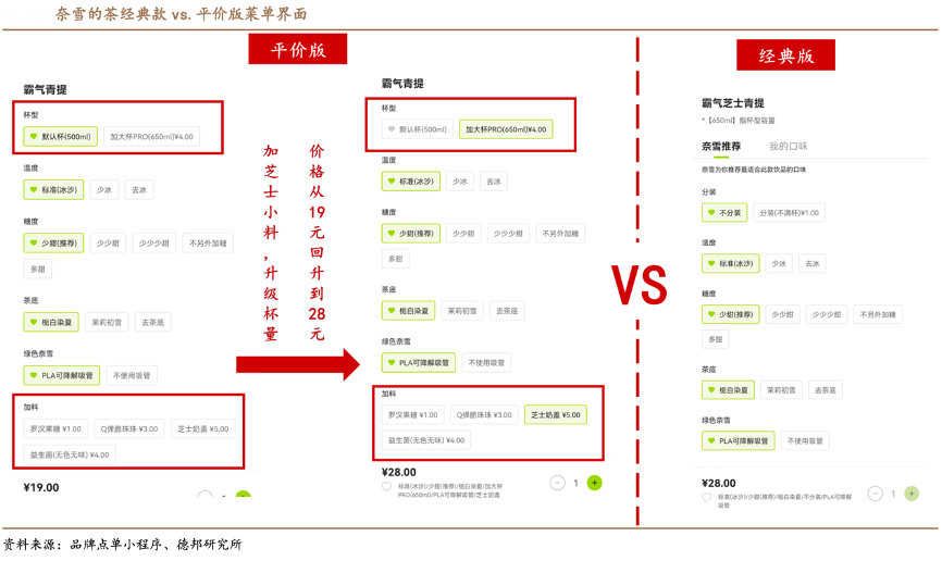 經典案例:根據品牌點單小程序、德邦研究所等綜合資訊表明,奈雪的茶有選擇的降價,經典款價格穩定,平價版杯量減少或小料降級。對比降價前后產品價格,可以發現奈雪經典款價格基本穩定,部分降價是通過對經典單品分量、小料“降級”實現,在保持品牌調性的基礎上,提供消費者更多元選擇。