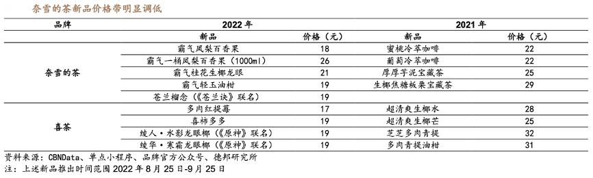 經典案例:根據CBNData、單點小程序、品牌官方公眾號、德邦研究所等綜合資訊表明,奈雪的茶新品價格全面調低,降低用戶嘗新門檻為品牌引流。奈雪新品已基本接近中端茶飲品牌對應單品價格。以葡萄果茶為例,奈雪的茶“霸氣葡萄”大杯 23 元,茶百道“紫喜葡 萄凍凍”大杯 18 元、一點點“葡萄柚綠”大杯 18 元、CoCo“星空葡萄”大杯 20 元。
