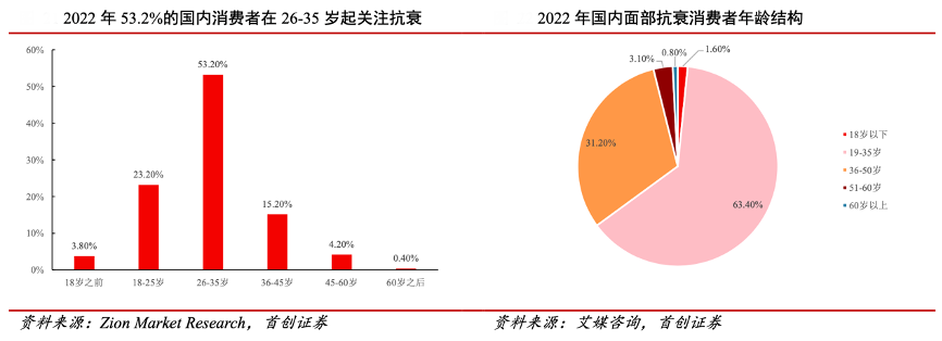 經(jīng)典案例:根據(jù)Zion Market Research、艾媒咨詢、首創(chuàng)證券等綜合資訊表明,低齡消費者抗衰需求呈提升趨勢,在國內(nèi)關注抗衰老的群體中,80.2%在 35 歲 以前消費抗衰老產(chǎn)品;使用面部抗衰產(chǎn)品的消費者中,35 歲以下消費者占 65%,女性占比 77.1%,女性及 90-00 后的年輕消費者已成為抗衰護膚品的主力消費群體。