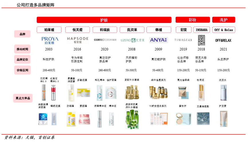 經(jīng)典案例:根據(jù)天貓、首創(chuàng)證券等綜合資訊表明,珀萊雅公司旗下多品牌覆蓋以寬年齡帶及價格帶,通過精準定位鎖定多元消費者需求。