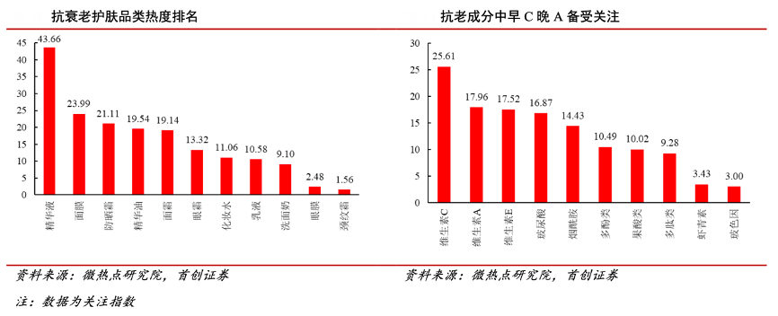 經典案例:根據微熱點研究院、首創證券等綜合資訊表明,據歐睿國際,國內抗衰護膚品市場由 2016 年的 356 億元增長至 2021 年 820 億元,市場復合增速達 18.1%。消費者對于抗衰的關注度僅次于基礎護膚的保濕補水,成為第二大關注載體。在抗衰的產品品類中,以精華的關注度居于首位,為高端抗老護膚線的重要營銷點,如雅詩蘭黛小棕瓶和蘭蔻小黑瓶均具有抗老的功效。