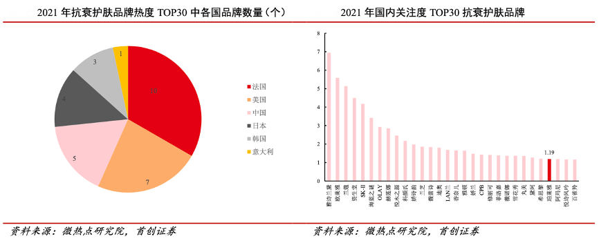 經典案例:根據微熱點研究院、首創證券等綜合資訊表明,在消費者關注度較高的抗衰品牌中,仍以國際品牌主導。關注度 TOP30 的抗衰品牌中,法國、 美國、中國品牌數量分別為 10、7、5 個,日韓緊隨其后。
