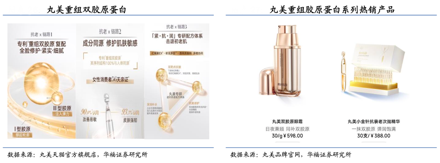 經典案例:根據丸美天貓官方旗艦店、丸美品牌官網、華福證券研究所等綜合資訊表明,多年來丸美持續深耕抗衰領域并迭代產品,2021 年 3 月,公司推出重磅成分重組雙膠原蛋白,該成分與人體天然的膠原蛋白氨基酸序列 100%一致,護膚品抗衰老領域的重大突破。雙膠原被應用于丸美重組膠原蛋白系列中,營銷端主打“膠原雙生,缺一不可”,并邀請 twins 擔任代言人,契合雙膠原成分宣傳,熱銷產品包括雙膠原眼霜、小金針抗衰老次拋精華。