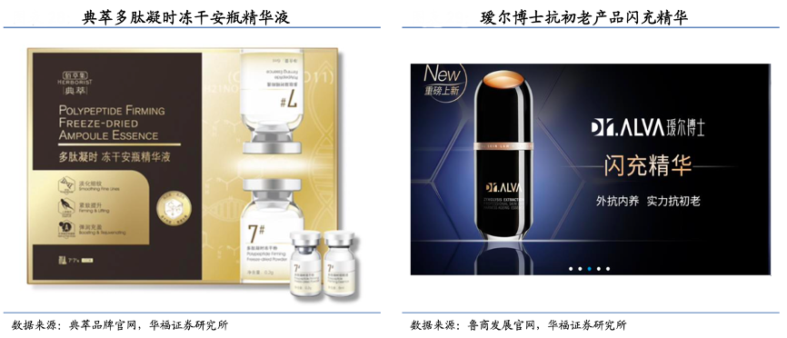 經典案例:根據典萃品牌官網、魯商發展官網、華福證券研究所等綜合資訊表明,魯商發展前瞻性布局抗衰原料,璦爾博士推出抗初老產品。原料端,魯商 發展依托福瑞達生物科技和焦點福瑞達,布局依克多因、羥丙基四氫吡喃三醇、富勒烯玻尿酸、益生菌發酵褐藻等抗衰原料,為旗下品牌做原料儲備。品牌端,璦爾博士 2022 年 3 月推出新品“閃充精華”,采用褐藻酵萃、六勝肽-1、后生元、多肽等成分,主打改善衰老皮膚微生態和抗皺功效,從全通路延緩衰老的進程,使皮膚恢復健康狀態。