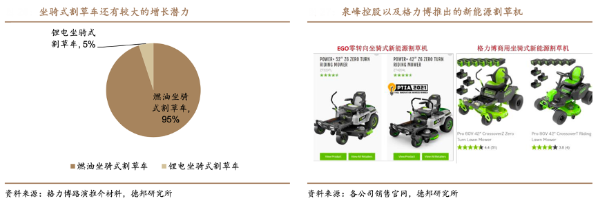 經典案例:根據格力博路演推介材料、各公司銷售官網、德邦研究所等綜合資訊表明,此前制約鋰電動力的騎乘式割草機產品核心為鋰電動力不足以及續航時間短的問題。但目前已經有多個企業開始布局鋰 電騎乘式割草機,如泉峰控股 2021 年推出搭載無刷電機技術的騎乘式割草機,以及推出全球第一臺鋰電零轉向騎乘式割草機面向高端市場。