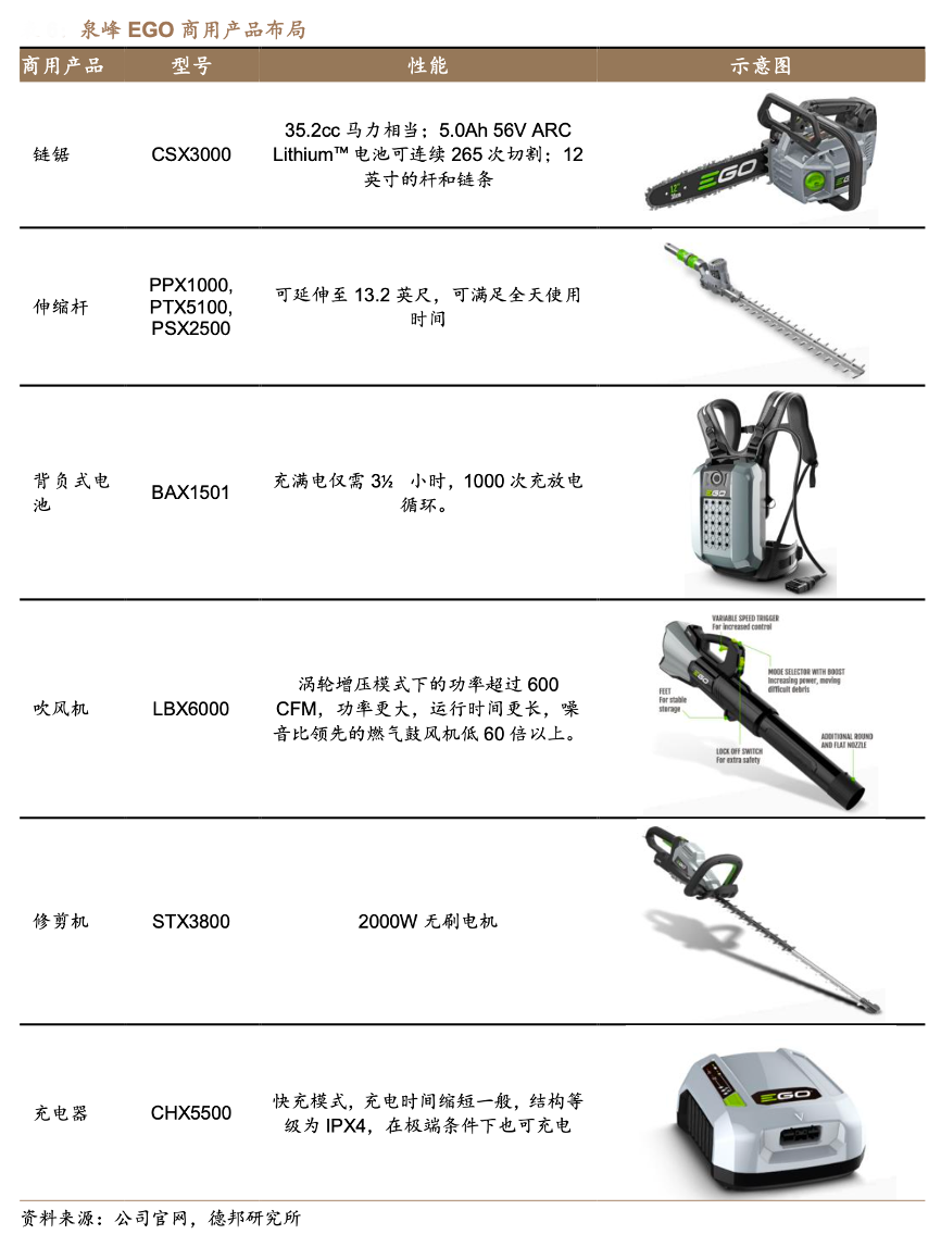 經(jīng)典案例:根據(jù)公司官網(wǎng)、德邦研究所等綜合資訊表明,泉峰EGO 目前產(chǎn)品主要為家用產(chǎn)品,面向高端消費(fèi)群體,平均售價遠(yuǎn)高于大眾市 場產(chǎn)品,率先推出全球首臺兼容電池平臺鋰電 ZTR 騎乘式割草車。公司同時也布局了商用領(lǐng)域,包括商用鏈鋸、商用伸縮桿、商用背負(fù)式電池 包、充電器、吹風(fēng)機(jī)、修枝機(jī)等產(chǎn)品。