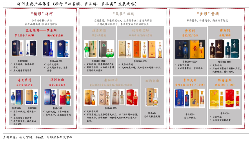 經典案例:根據公司官網、iFinD、西部證券研發中心等綜合資訊表明,洋河股份公司目前有洋河、雙溝及貴酒三大品牌,覆蓋禮贈/商務/宴席/自飲等細分消費場景,且在千元以內各個價格帶均有拳頭產品,產品矩陣豐富。其中高端品拉升品牌形象旨在舉高打低,次高端為增長引擎推動結構升級,中低端筑基穩固,提供堅實后盾,各線產品互為補充。