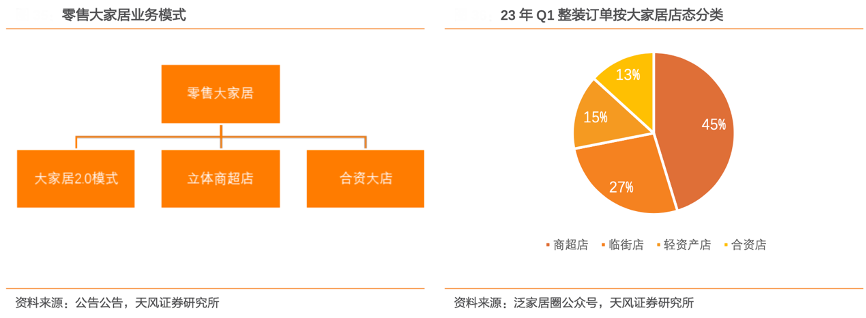 零售大家居未來規劃主要有 3 個路徑:大家居 2.0 模式,立體商超店,合資大店。23 年 Q1 整裝訂單累計 2151 戶,同比增長 1899%;按大家居店態分商超店 974 戶,臨街店 573 戶,輕資產店 319 戶,合資店 285 戶。