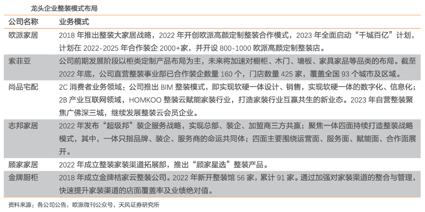 經典案例:根據各公司公告、歐派微刊公眾號、天風證券研究所等綜合資訊表明,隨著整裝行業的興起,歐派家居、志邦家居等企業紛紛進軍整裝行業。顧家家居 2022 年推出“顧家星選”整裝產品;志邦家居 2022 年發布“超級邦”裝企服務戰略,實現總部、 裝企、加盟商三方共贏。