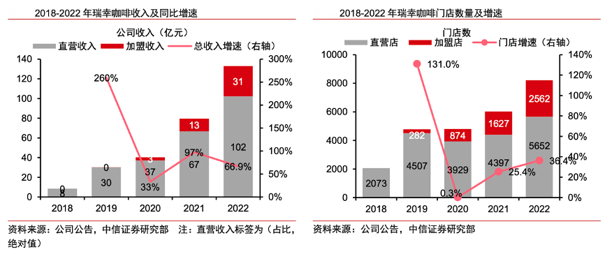 經典案例:根據公司公告、中信證券研究部等綜合資訊表明,瑞幸咖啡公司業務通過直營店、加盟店和無人咖啡機展開,直營為主,加盟門店數量和收入占 比 2023Q2 提升至 34%和 24%。消費場景方面,外賣廚房完成開拓期使命后已如期關閉,當前快取店為主力,FY22 末占比 97.6%,并設少量面積 120 平米+的悠享店輸出品牌形象。