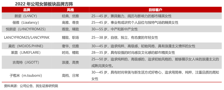 經典案例:根據公司公告、民生證券研究院等綜合資訊表明,朗姿股份公司7 大品牌通 過差異化的產品定位及設計風格,可迎合不同層次女性群體的差異化需求。“朗姿”為女裝板塊核心品牌,定位于為兼具魅力、閱歷與影響力的都市精英女性提供多場合系列服裝的高端女裝品牌。2018 年至 2021 年朗姿品牌營業收入從 9.64 億元增 長至 12.29 億元,營收持續增長,CAGR 達 8.43%,貢獻女裝板塊主要營業收入。