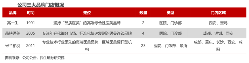 經典案例:根據公司公告、民生證券研究院等綜合資訊表明,朗姿通過”1+N“戰略形成中心輻射形態迅速擴張醫美板圖。在特定區域內以一家或多家大型機構縱深布局積累品牌口碑,再以若干家小型連鎖機構或診所擴大 人群覆蓋范圍并與核心機構形成協同,實現客群相互導流輸送。目前已擁有 29 家 醫療美容機構,其中綜合性醫院5 家、門診部或診所 24 家,主要分布在成都、西 安、重慶、深圳、長沙、寶雞和咸陽等地區。
