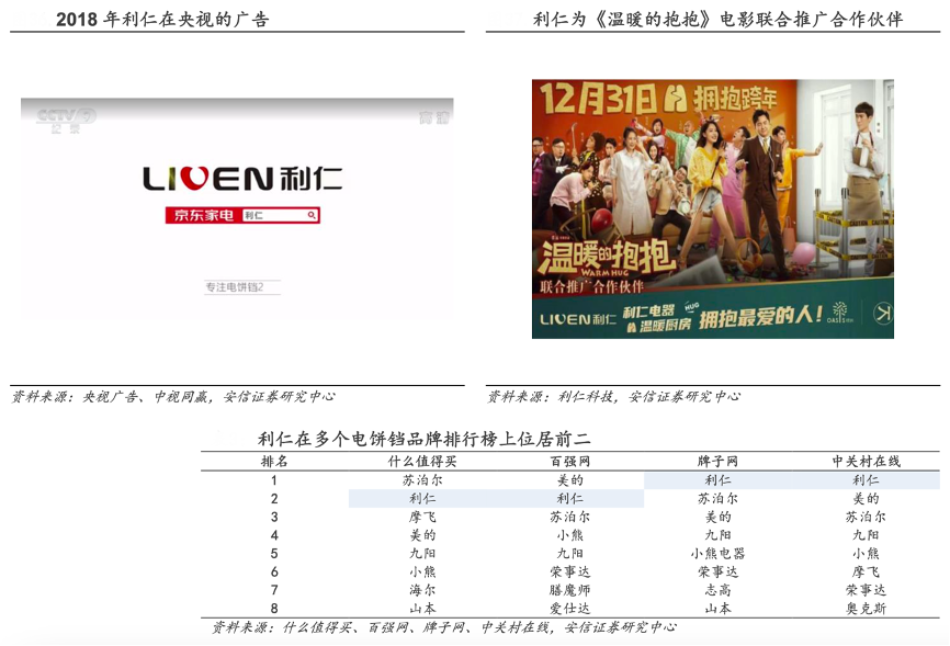 經(jīng)典案例:根據(jù)央視廣告、中視同贏、利仁科技、什么值得買、百強(qiáng)網(wǎng)、牌子網(wǎng)、中關(guān)村在線、安信證券研究中心等綜合資訊表明,利仁公司重視品牌打造,電餅鐺細(xì)分品類品牌優(yōu)勢顯著。早在 1996 年開始,公司便注冊了品牌商標(biāo),并在品牌形象打造上持續(xù)投入。公司曾在央視播出廣告,并贊助播出了當(dāng)時全國熱播的《舌尖上的中國 3》,提升了公司電餅鐺產(chǎn)品在全國的知名度。通過長時間品牌形象和消費者口碑的積累,公司在多個電餅鐺的品牌排行榜排名前二,體現(xiàn)了公司品牌在電餅鐺品類上的領(lǐng)先優(yōu)勢。