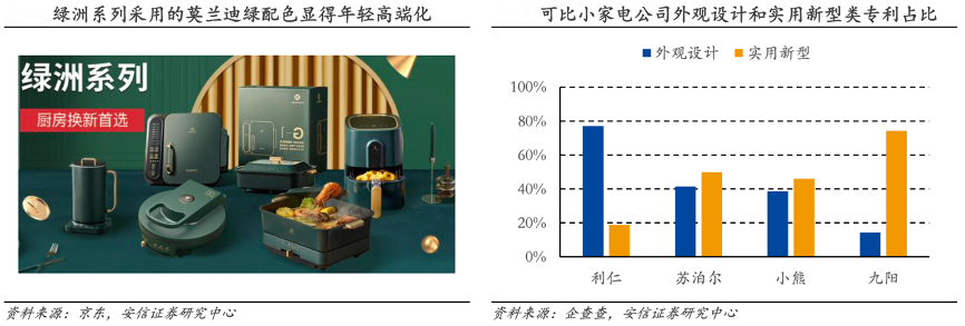 經(jīng)典案例:根據(jù)京東、企查查、安信證券研究中心等綜合資訊表明,利仁于 2019 年末推出了綠洲系列產(chǎn)品,產(chǎn)品包含電餅鐺、空氣炸鍋等多個廚電產(chǎn)品。系列產(chǎn)品不僅叫好也叫座,2019年該系列產(chǎn)品獲得“海峽杯工業(yè)設(shè)計(晉江)大賽”銀獎,系列中 G-3 型號的電餅鐺單品銷量已超 15 萬臺。綠洲系產(chǎn)品的成功,主要來源于公司在外觀設(shè)計上的厚積薄發(fā)。公司的專利類別中 77%約為外觀設(shè)計專利,在主要小家電公司中占比最高。