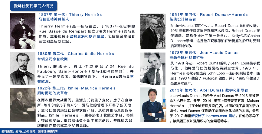 經典案例:根據愛馬仕公司官網、國海證券研究所等綜合資訊表明,愛馬仕六代掌門人均來自愛馬仕家族。