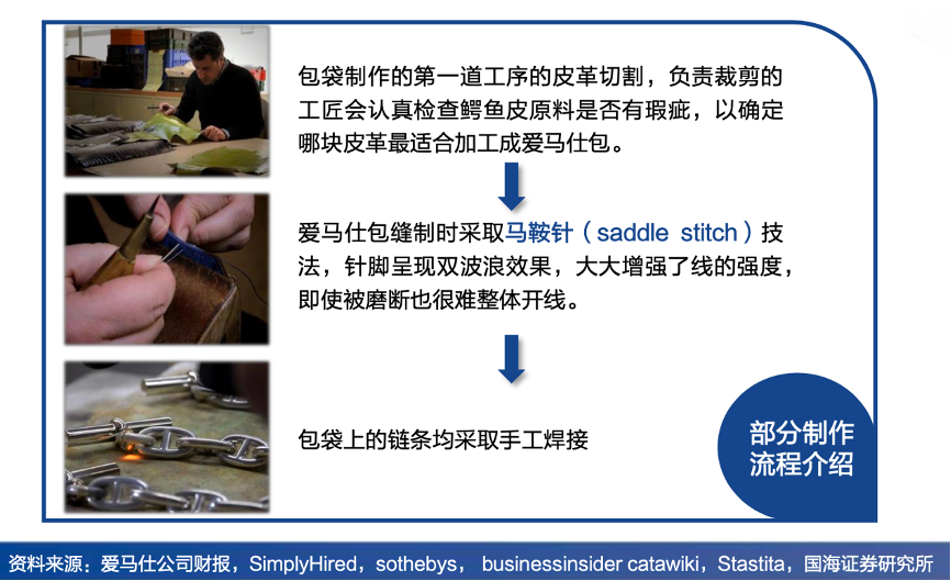 經典案例:根據愛馬仕公司財報、SimplyHired、sothebys、businessinsider catawiki、Stastita、國海證券研究所等綜合資訊表明,愛馬仕始終堅持精心手工制作每一件包袋和絲綢,以滿足客戶的個性化定制需求。由于整個制作流程均由人工完成,制作一個Kelly包平均約需要 25小時,一個Birkin包至少需要18小時,一個制造廠每月僅能生產15只 愛馬仕包。