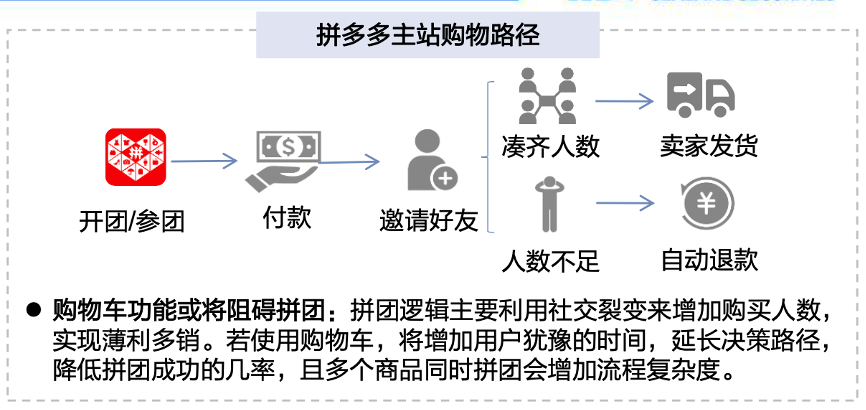經(jīng)典案例:根據(jù)拼多多APP、國(guó)海證券研究所等綜合資訊表明,拼多多APP無(wú)購(gòu)物車(chē)功能,縮短用戶(hù)決策路徑從而促進(jìn)快速轉(zhuǎn)化:傳統(tǒng)購(gòu)物車(chē)使用場(chǎng)景包括下 單決策過(guò)程、價(jià)格比較、合并付款、避免運(yùn)費(fèi)重復(fù)等,而拼多多APP設(shè)計(jì)無(wú)購(gòu)物車(chē)功能,利用“商品收藏”代替購(gòu)物車(chē),簡(jiǎn)化用戶(hù)購(gòu)物程序,實(shí)現(xiàn)即買(mǎi)即走,縮短消費(fèi)決策路徑和時(shí)間,從 而實(shí)現(xiàn)快速轉(zhuǎn)化。