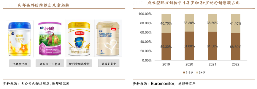 經典案例:根據各公司天貓旗艦店、Euromonitor、德邦研究所等綜合資訊表明,洞察到兒童營養配方奶粉的增長需求,伊利、飛鶴、君樂寶等頭部乳企品牌也已紛紛推出針對 3 歲以上兒童的四段奶粉產品,留住龐大的消費群體,延長產品生命周期,從供給端帶動行業升級。
