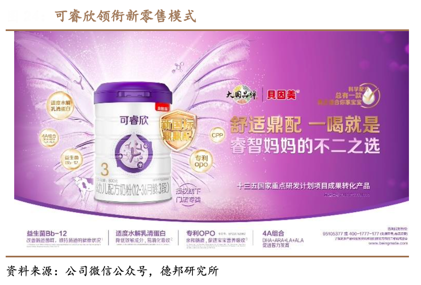 經(jīng)典案例:根據(jù)公司微信公眾號(hào)、德邦研究所等綜合資訊表明,貝因美2021 年度重點(diǎn)打造了“可睿欣”嬰幼兒配方乳粉,具有親舒腸道的功能,產(chǎn)品力強(qiáng),復(fù)購(gòu)率高。該產(chǎn)品自上市以來(lái)便定位新零售模式。新零售模式通過(guò)實(shí)時(shí)跟蹤價(jià)值鏈各環(huán)節(jié)的數(shù)據(jù)信息和用戶信息,將前后臺(tái)數(shù)據(jù)打通融合,極大提高了整個(gè)價(jià)值鏈的運(yùn)行效率; 同時(shí)按照人、貨、場(chǎng)的概念,精準(zhǔn)匹配門店、商圈及目標(biāo)客戶,精細(xì)運(yùn)維賦能終端門店。截止2022 年 11 月,可睿欣已覆蓋超過(guò) 1 萬(wàn)家門店。