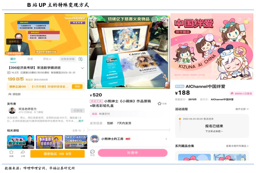 經典案例:根據嗶哩嗶哩官網、華福證券研究所等綜合資訊表明,除了商單廣告外,B 站因為其不同于流量驅動的內容生態特質,創作者們會有特殊的變現方式,知識區的 UP 主往往通過出售課程的方式獲得營收,手工繪畫區的 UP 主會在 B 站上出售自己的原創作品,而 Vtuber 即虛擬 UP 主可以通過發售其專屬衍生品如裝扮、表情包等獲得收入。