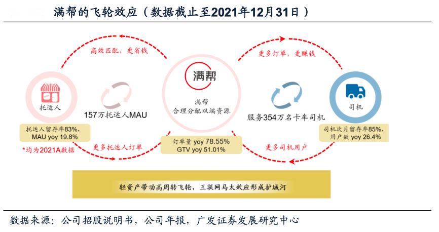 經典案例:根據公司招股說明書、公司年報、廣發證券發展研究中心等綜合資訊表明,滿幫整合了道路運輸,尤其是城際運輸龐大的長尾市場,這種由數百萬托運人和卡車司機跨路線進行的、涵蓋 數百萬貨物的高度復雜的動態編排很難復制,并對潛在競爭對手形成了很高的進入壁壘,打造了“托運人數量提升→發布訂單增加→司機數量提升→供需高效匹配→托運人數量提升”的閉環,雙邊網絡效應下形成增長飛輪,與更多生態系統參與者建立聯系,鞏固企業競爭優勢。