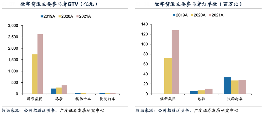 經典案例:根據公司招股說明書、廣發證券發展研究中心等綜合資訊表明,2021年滿幫成立了客戶體驗事業部,上線了“全能保障”計劃,截至2021年11月30日,對581萬人次司機、81萬人 次貨主進行了保障,共協助司機追討運費53萬單,追回運費7.8億。賠付保障效率大大提升,從原來的24小時,提升至目前的2小時,客訴率下降21%,客戶滿意度提升 17個點。對比其他數字貨運平臺,滿幫平臺的GTV、訂單數以及同比增速均顯著高于路歌、 福佑卡車等平臺。