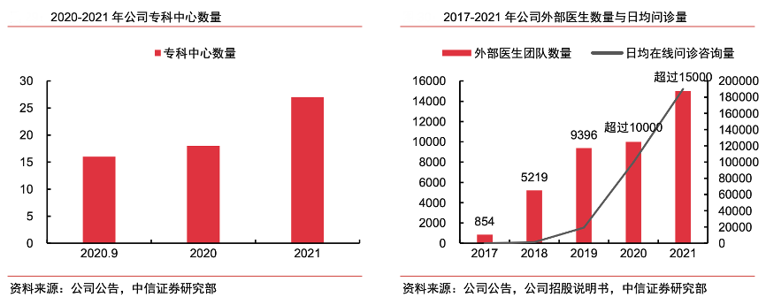 經典案例:根據公司公告、公司招股說明書、中信證券研究部等綜合資訊表明,京東健康公司近年來成立了包括心臟中心、耳鼻喉中心、感染及肝病中心、腦營養中心等多個專科中心,截至 2021 年底共擁有 27 個專科中心,吸引了百余位專家和頂級名醫加入。同時,公司通過專科中心連接更多的外部優質醫療資源,外部醫生團隊覆蓋超過 15000 家醫院。2022H1,公司推出專家在線、秒問京醫、夜間急診三項問診服務,日均在線問診咨詢量超過 25 萬次。