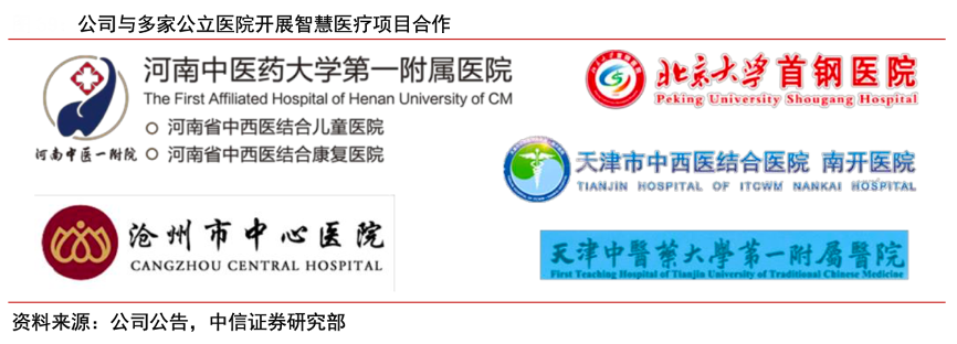 經典案例:根據公司公告、中信證券研究部等綜合資訊表明,京東健康公司近年來加速布局智慧醫療領域,其已與多家醫院展開合作:2020 年與天津市南開醫院合作搭建南開京東互聯網醫院,實現包括在線復診、健康咨詢等一體化服務;2021年與河南中醫藥大學第一附屬醫院共建互聯網醫院,年底累計注冊患者人數接近 15 萬;此外,公司還與首都醫科大學附屬北京地壇醫院達成戰略合作,幫助建立互聯網醫院。