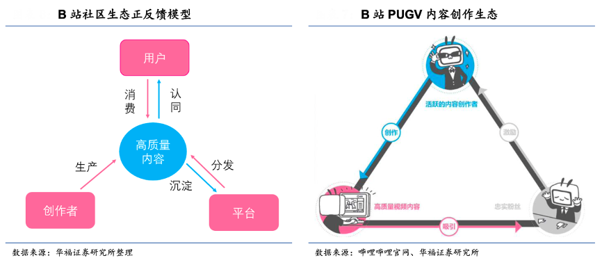 經(jīng)典案例:根據(jù)嗶哩嗶哩官網(wǎng)、華福證券研究所等綜合資訊表明,雙邊平臺效應+社區(qū)共識強化,B 站以內(nèi)容形成了增長飛輪。B 站的視頻內(nèi)容并 不以傳統(tǒng)的影視綜藝為主,而是以 PUGV(Professional User Generated Video)為核心,即用戶自制的、經(jīng)過專業(yè)策劃和制作的高質(zhì)量視頻,PUGV 內(nèi)容 B 站已經(jīng)形成了“UP 主創(chuàng)作高質(zhì)量視頻內(nèi)容-高質(zhì)量視頻內(nèi)容吸引忠實粉絲-忠誠粉絲的正反饋 激勵 UP 主持續(xù)產(chǎn)出優(yōu)質(zhì)內(nèi)容”的生態(tài)閉環(huán)。