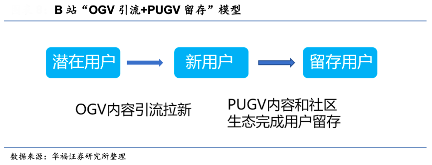 經(jīng)典案例:根據(jù)嗶哩嗶哩財報、華福證券研究所等綜合資訊表明,B 站以優(yōu)質(zhì) OGV 和 PUGV 內(nèi)容作為生態(tài)聯(lián)結的核心動能。專業(yè)的 OGV 內(nèi) 容吸引新用戶后,PUGV 內(nèi)容所連接的強粘性用戶生態(tài)成為新用戶留存的主陣地。如B 站聯(lián)合迪士尼出品原 創(chuàng)律政主題劇集《正義的算法》,在影視區(qū)、娛樂區(qū)、知識區(qū)也衍生出不少 PUGV 二創(chuàng)內(nèi)容。優(yōu)質(zhì) OGV 內(nèi)容對站外拉新產(chǎn)生了促進作用,接著根據(jù)用戶興趣愛好進行分 流,B 站豐富的 PUGV 內(nèi)容和獨特的社區(qū)氛圍使得新用戶愿意留存下來。這樣“OGV 引流+PUGV 留存”的模式成為了 B 站特有的用戶增長優(yōu)勢。