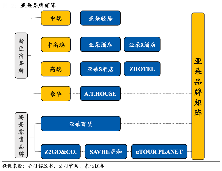 經典案例:根據公司招股書、公司官網和東北證券等綜合資訊表明,亞朵公司旗下 6 大酒店品牌涵蓋中端(亞朵輕居)、中高端(亞朵、亞朵 X)、高端(亞朵 S、ZHOTEL)和豪華(A.T.HOUSE)不同檔次,基于差異化定位覆蓋商務旅客到高端商務人士的廣泛客群,截至 2022Q3 公司旗下在營酒店數達 880 家,客房數 10.27 萬間,根據弗若斯特沙利文數據,截至 2021 年底亞朵已成為中國最大的中高端酒店品牌。