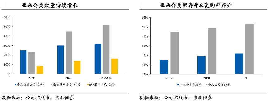 經(jīng)典案例:根據(jù)公司招股書(shū)、東北證券等綜合資訊表明,亞朵通過(guò) A-Card 會(huì)員計(jì)劃培養(yǎng)客戶(hù)忠誠(chéng)度和粘性,會(huì)員基數(shù)快速增長(zhǎng),2016-2021年個(gè)人會(huì)員復(fù)合增速為 48.7%,30 歲以下注冊(cè)會(huì)員復(fù)合增速為83.9%,截至 2022Q2 公司注冊(cè)個(gè)人會(huì)員數(shù)達(dá) 3200 萬(wàn)。2019-2021 年公司會(huì)員留存率分別為 14.8%/19.4%/21.7%,復(fù)購(gòu)率分別為44.6%/48.7%/52.8%,會(huì)員黏性持續(xù)提升, 打造私域流量蓄水池。