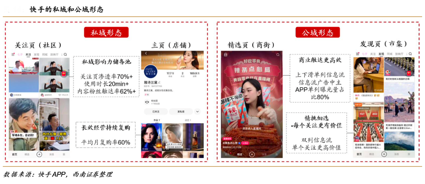 經(jīng)典案例:根據(jù)快手APP、西南證券等綜合資訊表明,快手在保留雙列布局的同時加入單列布局,實現(xiàn)厚度和廣度并存。 從頁面形態(tài)來看, 公域有兩種形 態(tài),上下滑精選頁和雙列信息流發(fā)現(xiàn)頁,私域有兩種形態(tài), 關(guān)注頁是由自己組合的社區(qū)或街坊,按照自己的喜好從商街和市集中挑選;店鋪是商家的經(jīng)營陣地,用于商家塑造品牌形象,提高品牌認知度。