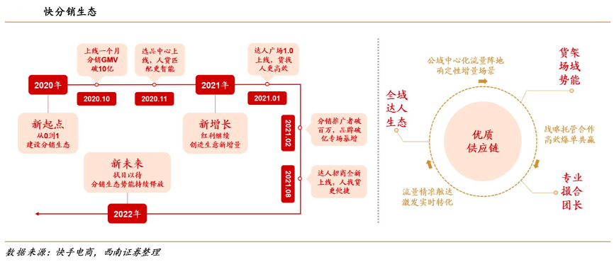 經典案例:根據快手電商、西南證券等綜合資訊表明,2021 年 11 月 26 日,快手將官方電商優選平臺好物聯 盟升級為快分銷,2021Q4,快手逾 30% 的電商交易總額來自快分銷。快分銷供給能力的提升以及商家和達人匹配效率的提升,進一 步推動了快手電商業務的閉環建設。根據 2022 快手創作者大會,22H1 快分銷 GMV 同比增長 116%,達人推廣規模人數超 700 萬,累計商家數超 20 萬,分銷庫商品接近 9000 萬。