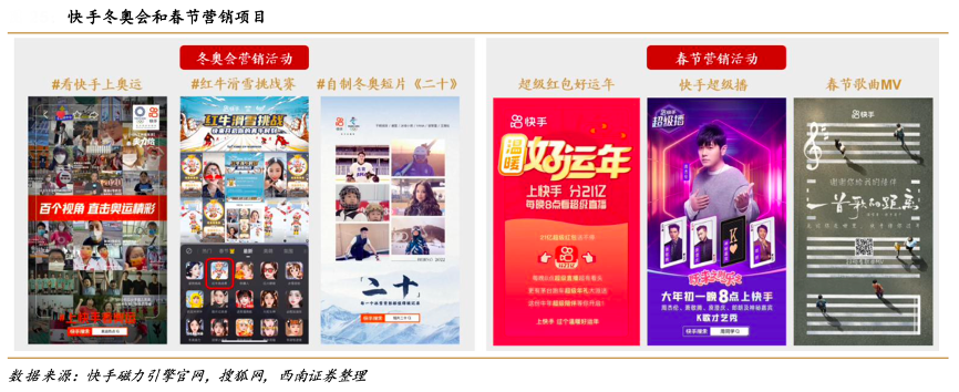 經典案例:根據快手磁力引擎官網、搜狐網、西南證券等綜合資訊表明,2022 年初,快手推出了冬奧會和春節營銷兩大項目,通過豐富的創意展現了自身平臺的內容營銷能力,冬奧會項目吸引的廣告主超 20 個,包括中國移動、聯想、三星、豐田中國、安踏、寶潔、加多寶、清揚、勁酒、 紅牛、金領冠等,春節營銷活動吸引廣告主超 10 個,品牌總曝光 2946 億、品牌總漲粉 4651 萬,兩大活動不僅幫助快手爭奪了 C 端流量,也在 B 端實現了品牌廣告的躍遷。