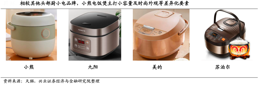 經典案例:根據天貓、興業證券經濟與金融研究院等綜合資訊表明,小熊公司目前已進入傳統小家電市場,區別于美九蘇,小熊延續一貫策略,從自身年輕 化定位出發,產品多主打單人款,外觀設計偏向年輕化、時尚化,注重性價比。以電飯煲為例,小熊產品主打一人食小容量,產品定價 150 元左右,遠低于美蘇九電飯煲 200-400 元的均價,形成差異化競爭。