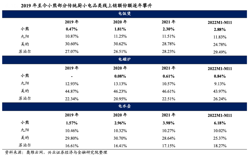 經典案例:根據奧維云網、興業證券經濟與金融研究院等綜合資訊表明,2019 年至今小熊在電飯煲、電磁爐、電水壺等傳統小家電品類線上銷額份額逐年攀升。
