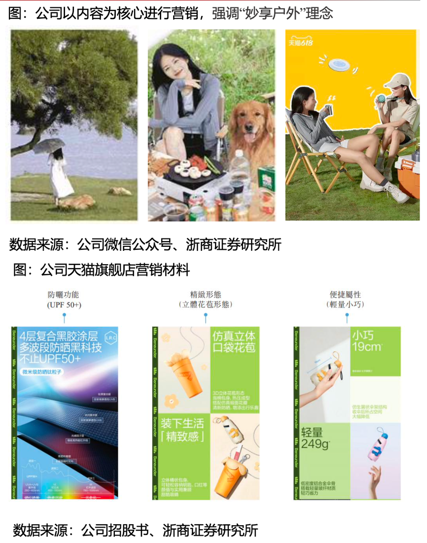 經典案例:根據公司微信公眾號、公司天貓旗艦店、公司招股書、浙商證券研究所等綜合資訊表明,蕉下強調與用戶交互,以內容為核心。在整個營銷過程中,公司專注于傳達自身產品如何利用前沿技術滿足用戶需求,并與專業檢測機構與KOL合作進行產品測試及評估以完成消費者教育。目前其覆蓋天貓、抖音、微信、微博、小紅書等平臺,截至21年底,在國內流行社交平臺合計擁有粉絲1400萬。
