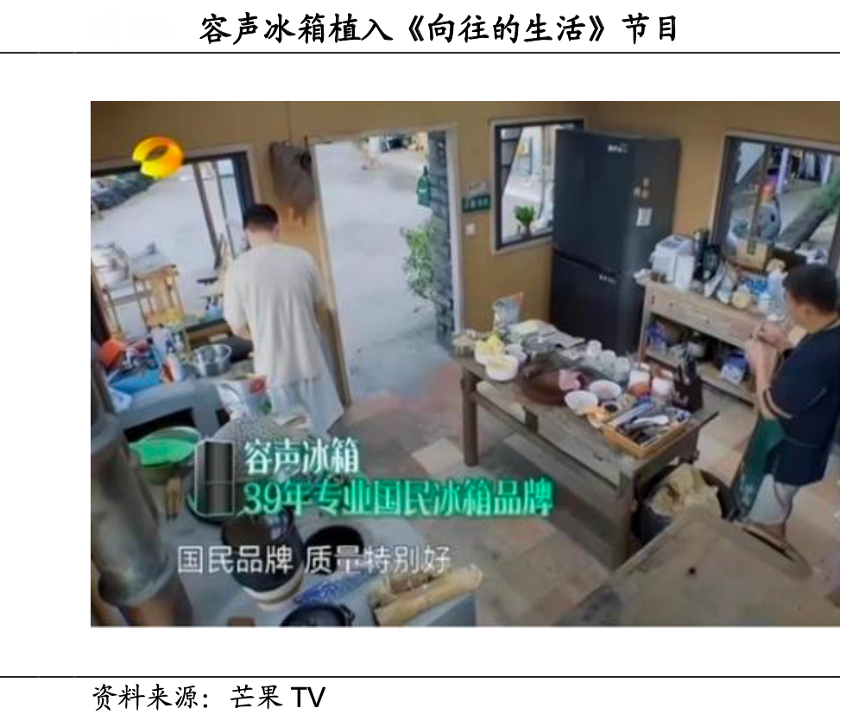 經(jīng)典案例:根據(jù)芒果TV、國海證券研究所等綜合資訊表明,結(jié)合2022 年京東大數(shù)據(jù)顯示,2021 年 1 月至 2022 年 1 月京東線上洗衣機(jī)營銷方式中 IP 聯(lián)名、明星同款分別占比27%、16%,年輕流量帶動消費(fèi)已有所成效。2022Q3 容聲贊助的綜藝《向往的生活》熱播,容聲冰箱產(chǎn)品植入蘑菇屋,節(jié)目期間容聲冰箱與節(jié)目相關(guān)話題閱讀量超過 1 億、視頻播放量達(dá)到 2.7 億,超百萬人參與互動,帶動容聲 冰箱 2022Q3 營收增長 27%。
